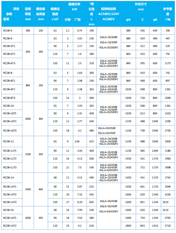 四、RCDB系列懸掛盤(pán)式自冷電磁除鐵器主要技術(shù)參數(shù)、外形尺寸 執(zhí)行標(biāo)準(zhǔn):JB/T7689